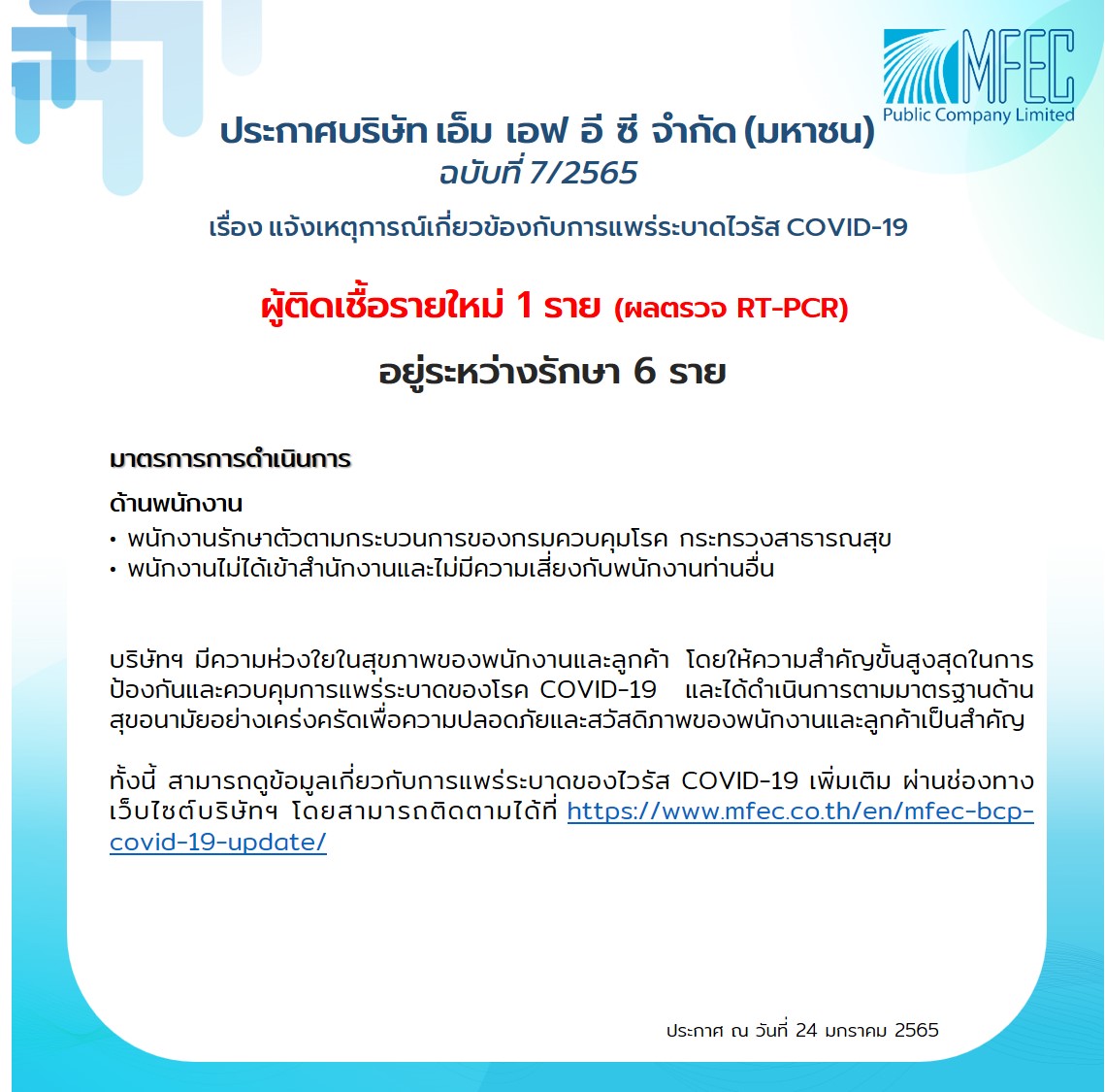 ประกาศบริษัท เอ็ม เอฟ อี ซี จำกัด (มหาชน) ฉบับที่ 7/2565 เรื่อง แจ้งเหตุการณ์เกี่ยวข้องกับการแพร่ระบาดไวรัสโควิด-19