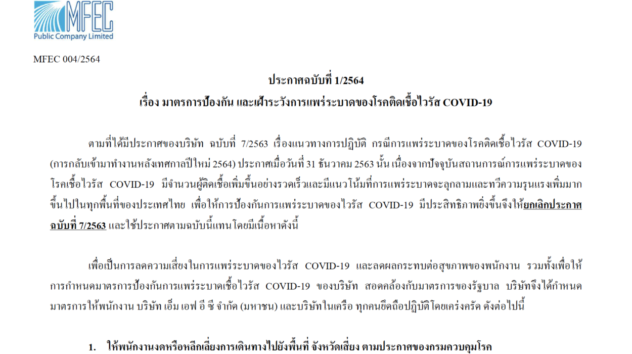 เรื่อง มาตรการป้องกันและเฝ้าระวังการแพร่ระบาดของโรคติดเชื้อไวรัส COVID-19 ณ วันที่ 1 มีนาคม 2564