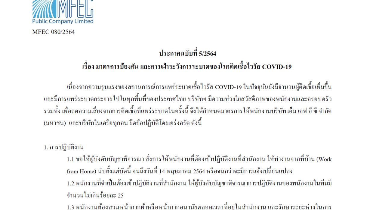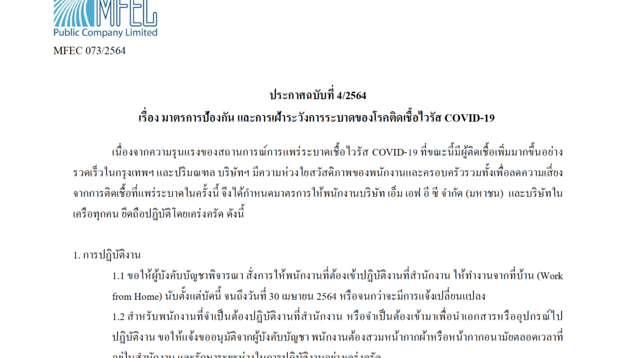 เรื่อง มาตรการป้องกันและเฝ้าระวังการแพร่ระบาดของโรคติดเชื้อไวรัส COVID-19 ณ วันที่ 8 เมษายน 2564