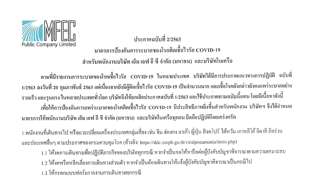 เรื่อง มาตรการป้องกันและเฝ้าระวังการแพร่ระบาดของโรคติดเชื้อไวรัส COVID-19 ณ วันที่ 20 กุมภาพันธ์ 2563