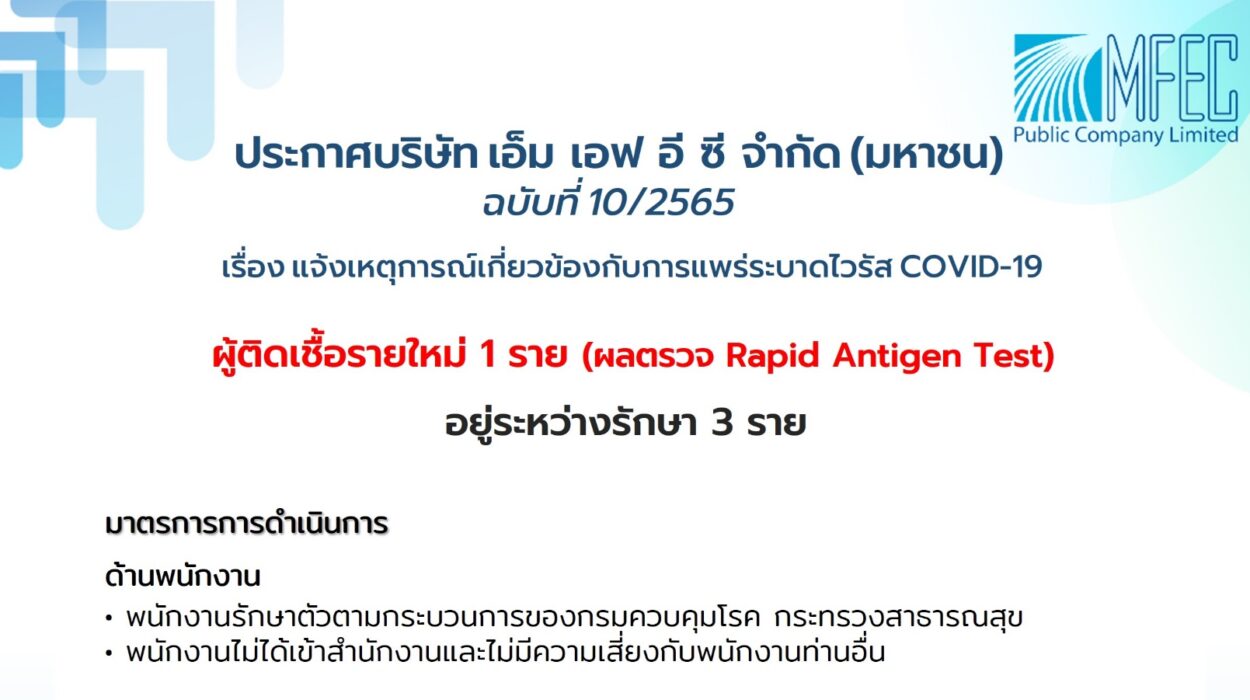 ประกาศบริษัท เอ็ม เอฟ อี ซี จำกัด (มหาชน) ฉบับที่ 10/2565 เรื่อง แจ้งเหตุการณ์เกี่ยวข้องกับการแพร่ระบาดไวรัสโควิด-19