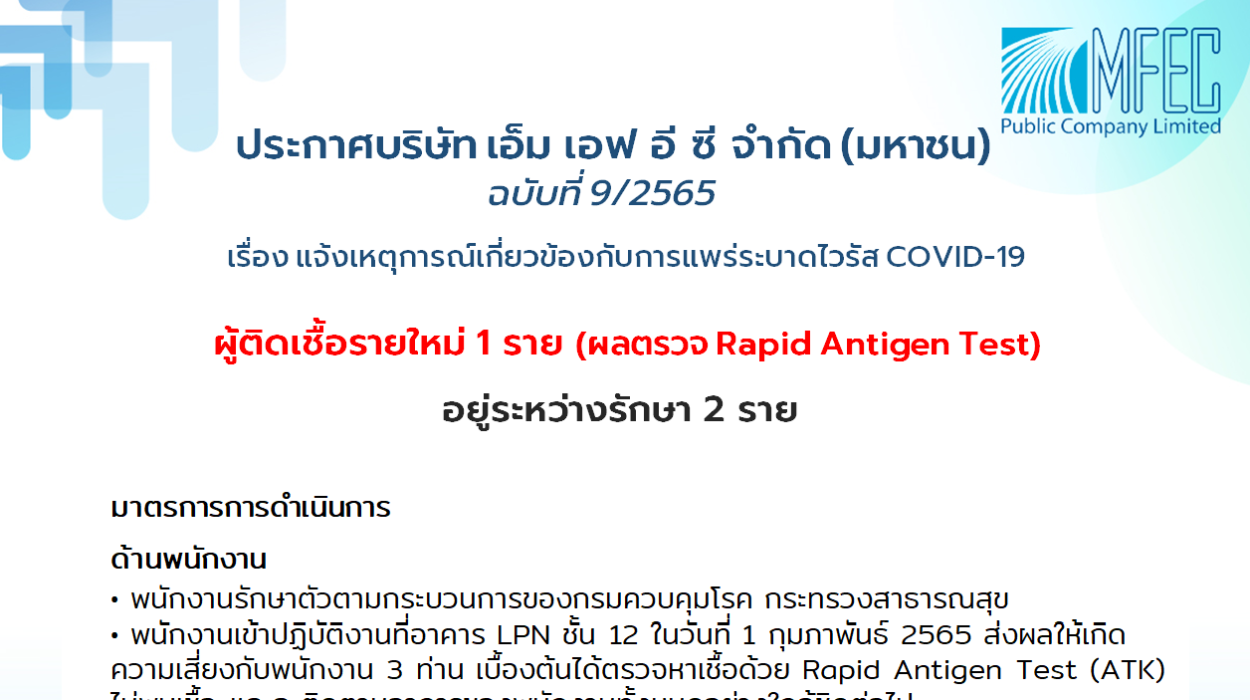 ประกาศบริษัท เอ็ม เอฟ อี ซี จำกัด (มหาชน) ฉบับที่ 9/2565 เรื่อง แจ้งเหตุการณ์เกี่ยวข้องกับการแพร่ระบาดไวรัสโควิด-19