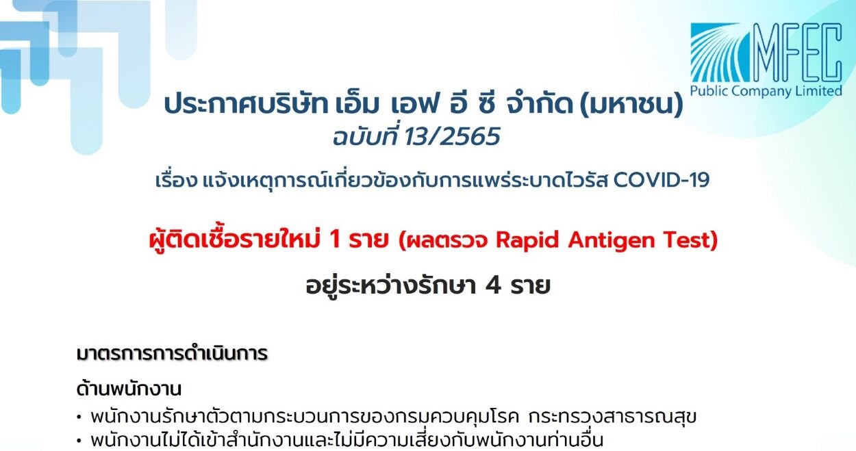 ประกาศบริษัท เอ็ม เอฟ อี ซี จำกัด (มหาชน) ฉบับที่ 13/2565 เรื่อง แจ้งเหตุการณ์เกี่ยวข้องกับการแพร่ระบาดไวรัสโควิด-19