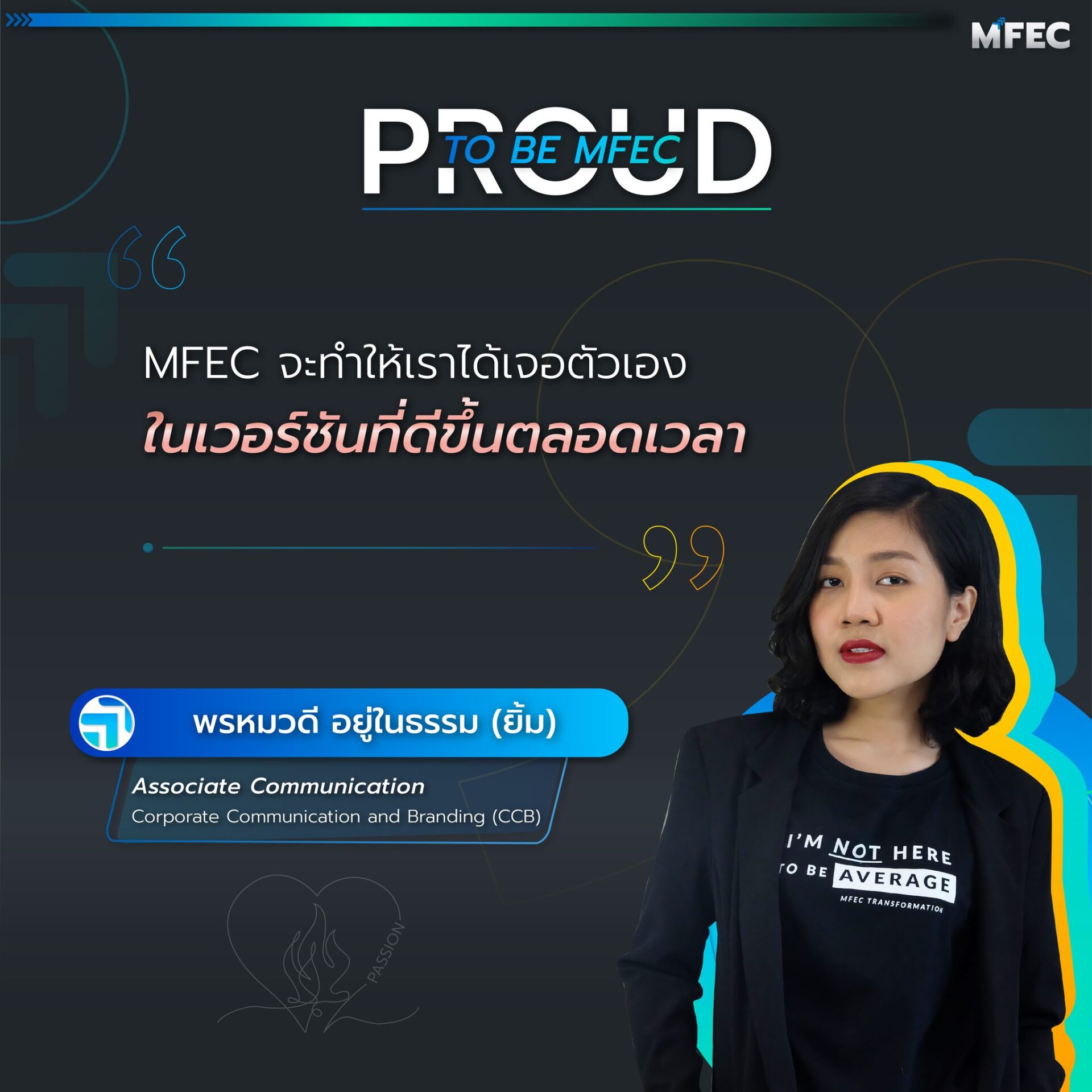 “ทีนี้ก็ได้เริ่มช่วยเขาคิดแคมเปญ เพราะว่า PE (People Excellence ทีม HR ของ MFEC) ต้องจัดกิจกรรมทุก ๆ เทศกาล พี่ก็จะเริ่มเข้าไปช่วยเขาไม่ว่าจะเป็นสงกรานต์ วันนู้นวันนี่เต็มไปหมด ตอนนั้นก็คือเรา Enjoy แล้วก็รู้สึกว่าทำได้นี่นา คือก็เคยคิดว่าตัวเองทำไม่ได้เหมือนกัน” จนไปถึงจุดหนึ่งที่องค์กรมีการ Transform การสื่อสารก็ถูกนำมาพูดถึงมากยิ่งขึ้น และปรับเปลี่ยนมาเรื่อย ๆ จนมีทีมแยกออกมาจาก PE และเปลี่ยนชื่อเป็น Corporate Communication and Branding