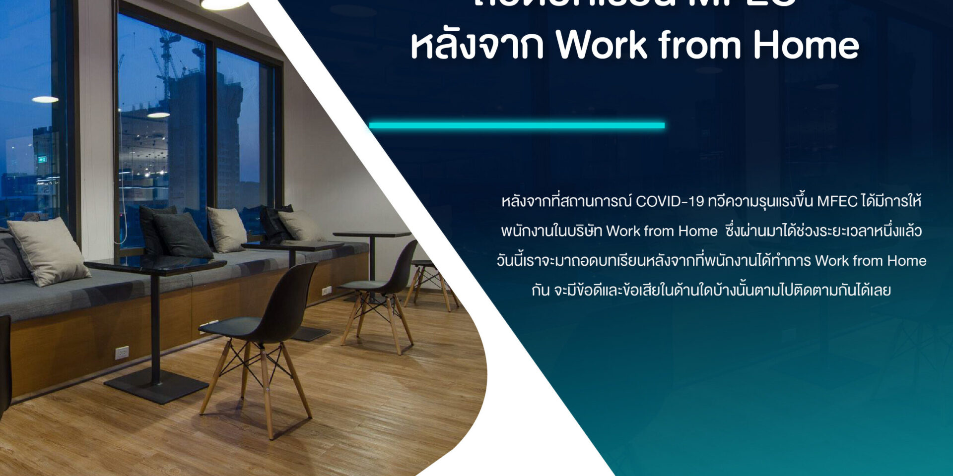 หลังจากที่สถานการณ์ COVID-19 ทวีความรุนแรงขึ้น MFEC ได้มีการให้พนักงานในบริษัท Work from Home ซึ่งผ่านมาได้ช่วงระยะเวลาหนึ่งแล้ว วันนี้เราจะมาถอดบทเรียนหลังจากที่พนักงานได้ทำการ Work from Home กัน จะมีข้อดีและข้อเสียในด้านใดบ้างนั้นตามไปติดตามกันได้เลยค่ะ