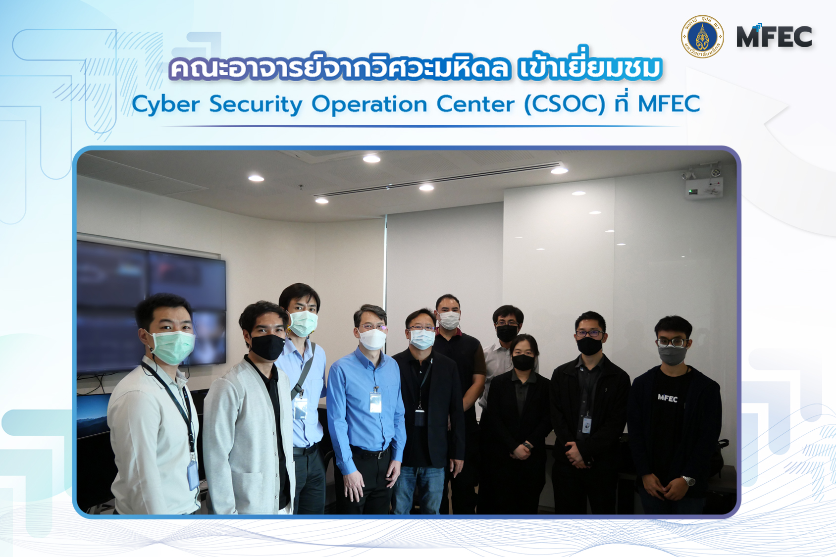 หลังจากลงนามบันทึกข้อตกลงความร่วมมือ MOU เมื่อวันที่ 19 เมษายนที่ผ่านมา คณะอาจารย์จากคณะวิศวกรรมศาสตร์ มหาวิทยาลัยมหิดลได้เดินทางเข้าเยี่ยมชม Cyber Security Operation Center (CSOC) หรือศูนย์ปฏิบัติการเฝ้าระวังความมั่นคงปลอดภัยระบบเทคโนโลยีสารสนเทศ ที่ MFEC โดยมีคุณก่อกนก ภัทรเมธาวรกุล Senior Information Security Director และทีมงาน CSOC จากทีม Information Security ให้การต้อนรับในการศึกษาดูงาน พร้อมทั้งแลกเปลี่ยนประสบการณ์ด้านกระบวนการบริหารจัดการ CSOC ในระดับองค์กร