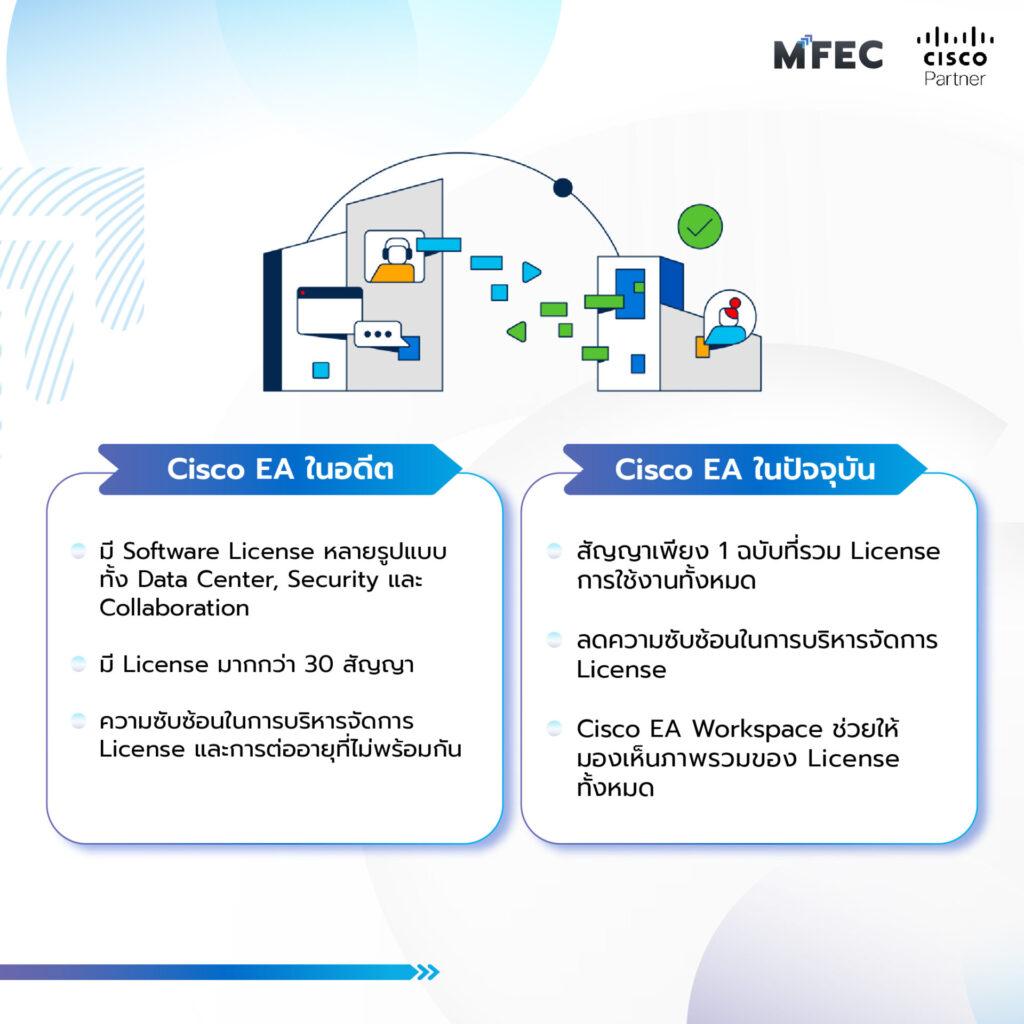 - Cisco EA ช่วยเพิ่มประสิทธิภาพการทำงานในองค์กรจากการลดเวลาและทรัพยากรที่ต้องใช้ไปกับการติดตามสถานะการใช้งานและดูแลการต่ออายุซอฟต์แวร์